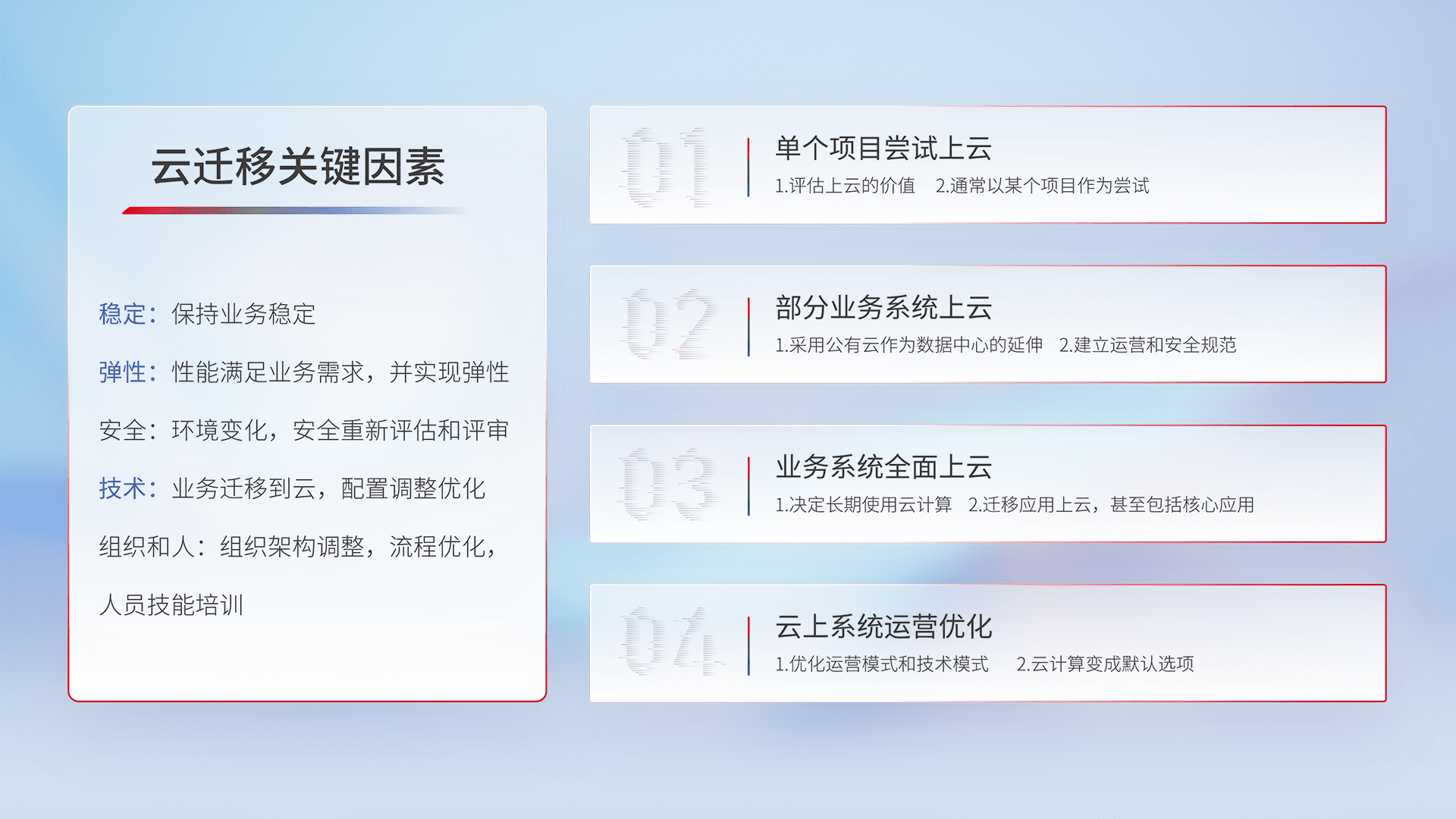 结合实际业务,,,,从规划设计、、、、云平台选型、、云原生改造、、、数据迁移、、、集成交付,,,迁移全过程为客户识别最佳上云路径,,,做好风险识别管理,,设计网络架构、、、、身份权限、、安全审计合规、、、、操作审计、、、、日志审计、、、监控告警策略、、、、多站点容灾设计等,,,对云上基础设施进行整体规划,,,提升IT治理水平,,以满足弹性、、高可用、、高性能的需求。。。。